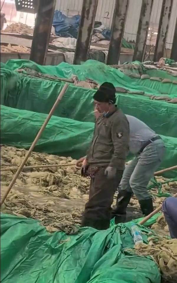工人醃製池邊抽煙吐痰畫面曝光