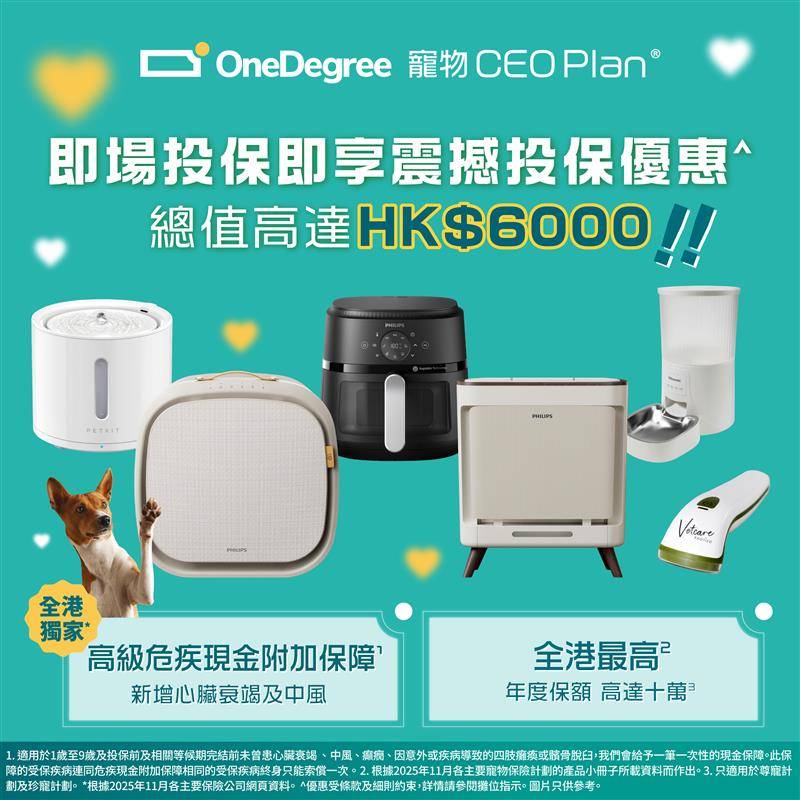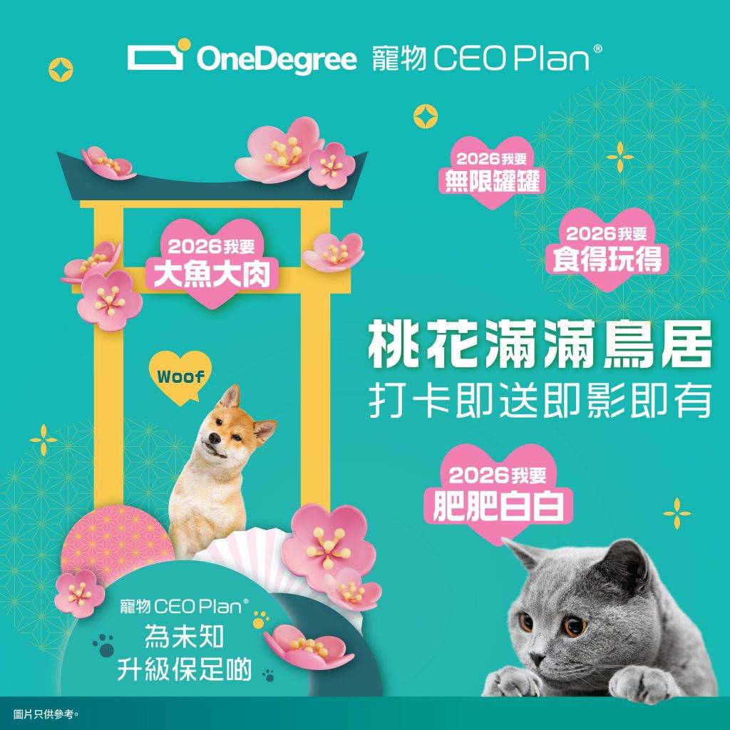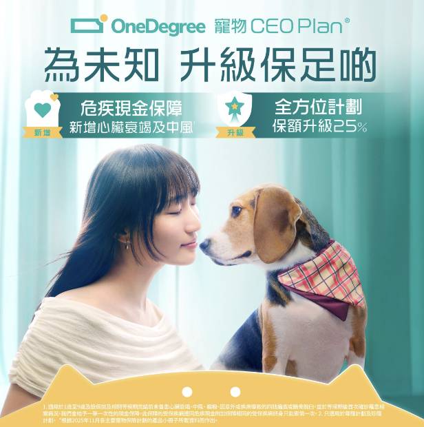 新一年想幫毛孩升級保障?OneDegree ^寵物 CEO Plan® 提供全港最高 HK$100,000 醫療保額,合資格醫療費用可賠付九成,並承諾終身續保,不設年齡限制。升級『高級危疾現金附加保障』涵蓋心臟衰竭及中風,醫療範圍包括門診、化驗、藥物、X 光、超聲波、住院及手術,珍寵計劃更延伸至 MRI 同 CT。