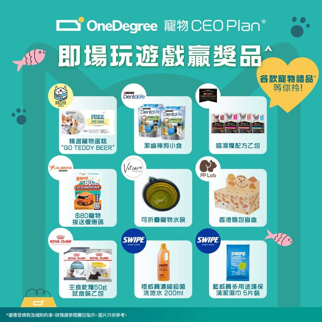 OneDegree 攤位當然唔止有投保優惠咁簡單,仲可以即場參加互動遊戲贏豐富禮品!寵物零食、寵物用品、清潔品等*豐富獎品等你拎,主人們一定要嚟OneDegree 攤位玩遊戲拎禮物 !