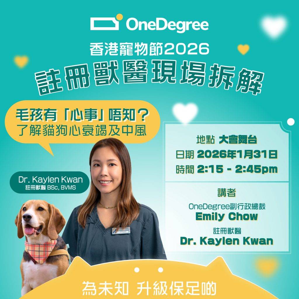 OneDegree 今次寵物節請到註冊獸醫 Dr. Kaylen Kwan 親身到場,同大家分享貓狗常見嘅兩大危疾——心臟衰竭同中風。講座入面,Dr. Kwan 會用簡單易明嘅方式拆解病因同症狀,仲會拎出真實臨床個案,教大家治療方法同照顧心得,等主人可以更清楚知道毛孩有咩健康風險。