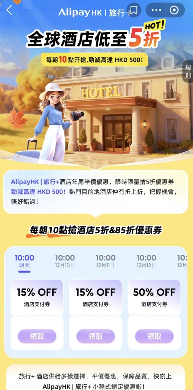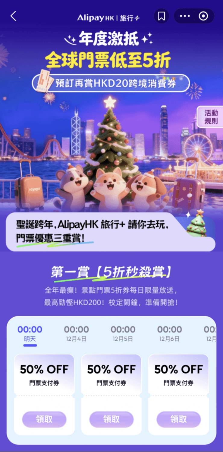 部分優惠每日限量或分階段推出,各位爸爸媽媽 plan 緊聖誕跨年之旅或者下年親子遊,不妨即刻打開 AlipayHK 睇下有咩著數,啱用嘅話記得拎定先啦!