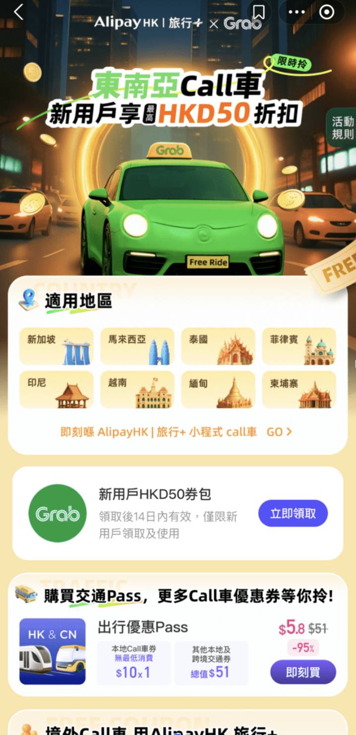 攻略3:一家大細出入更方便!東南亞 Grab 新客享 $50 禮券