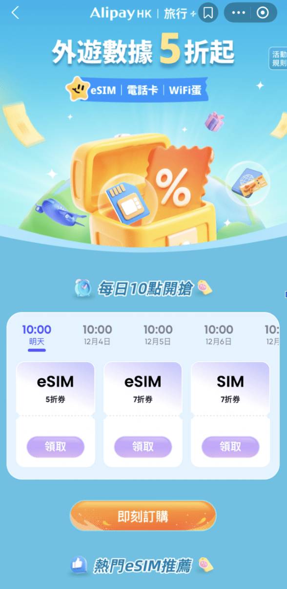 今時今日去旅行,無數據等於無咗靈魂!無論係要 po story 打卡、用 Google Maps 搵路,定係搵附近有咩好食,都要靠網絡。AlipayHK「旅行+」提供 eSIM、SIM 卡同 WiFi 蛋預訂服務,每日朝早 10 點開搶 5 折優惠券,上限減 $10!