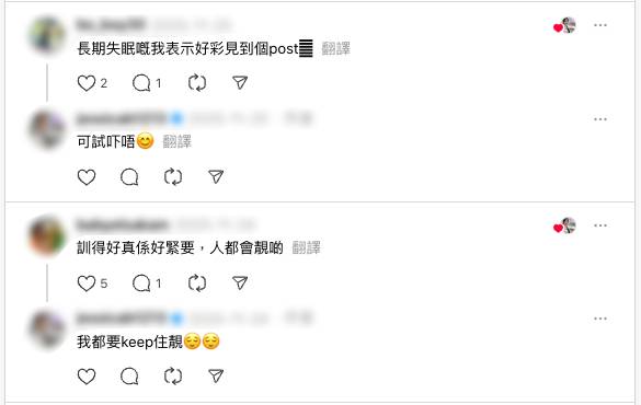 貼文一出立即引來不少同受睡眠之苦的脆友留言,指「長期失眠嘅我表示好彩見到個post」、「幫助到睡眠咁好!我好需要🥺🥺」、「Thanksss it saves me 🥹🙏🏻之前一路搵緊食邊隻牌子好瞓啲😭」「冇藥性又訓得到,聽落幾好😌」