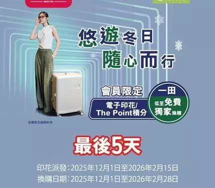 🛫計劃緊農曆新年出遊定長途旅行?而家係最後機會!! 嚟一田用電子印花或The Point積分低至免費換購2025最新CURVUS系列行李箱✈️黑白兩色三個尺寸任揀,超輕超耐用,裝滿戰利品都唔驚爆箱😍快啲嚟換佢返屋企啦💨!