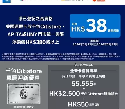 *登記期及推廣期: 2026年1月23日至2026年2月23日。登記卡優惠只適用於成功登記此優惠之合資格卡。推廣期內每張已登記卡最多可享簽賬回贈1次(最高合共HK$38)。名額有限,先到先得。優惠不適用於指定店舖, 詳情參閱條款及細則: https://go.amex/apita-uny-citistore-tnc-cn。