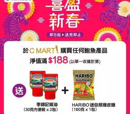 • 優惠詳情:購買任何鮑魚產品淨值滿$188,送李錦記蠔油 + HARIBO迷你熊橡皮糖