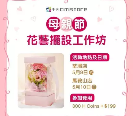 母親節將至,由專業導師指導,學習插花技巧,親手製作獨一無二的花藝擺設🌷,為母親送上最窩心的手作禮物🎁!名額有限,先到先得,約埋朋友一齊報名啦🥳!工作坊當天購買指定母親節禮盒更享9折優惠,詳情請向店員查詢。