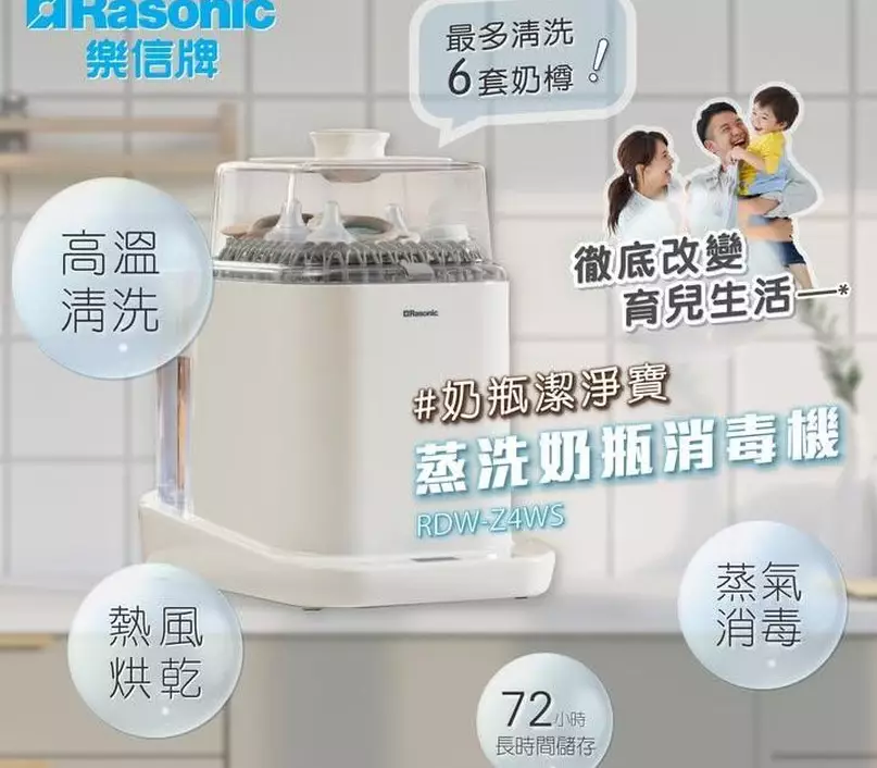Rasonic 新母嬰系列首部4合1 #蒸洗奶瓶消毒機 (#奶瓶潔淨寶 RDW-Z4WS),免安裝設計,一次清洗6套奶瓶。它擁有360度旋轉噴洗,加上強力水柱及25個清潔噴孔與專用支架。一部洗奶瓶機能做到高溫清洗、蒸氣消毒、熱風烘乾及長效儲存的4大功能,徹底改變育兒生活!