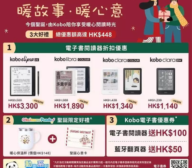 2025年12月22日至31日期間,購買指定Kobo電子書閱讀器享高達$200折扣優惠,再送Okaimono Panda! 聖誕禮盒及電子書券,優惠總值高達HK$448!📚