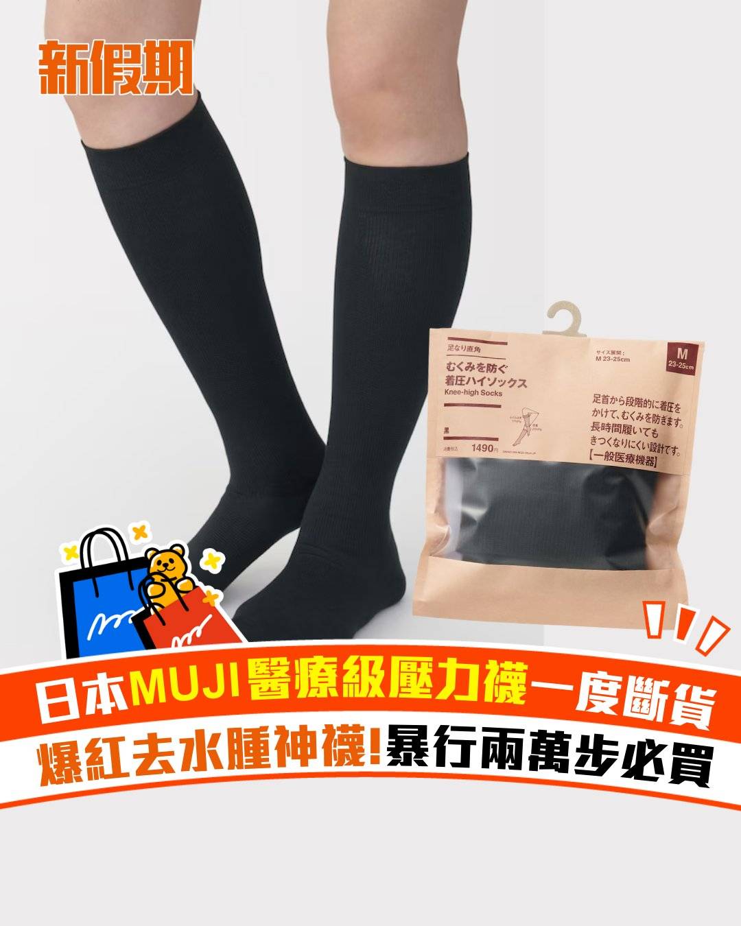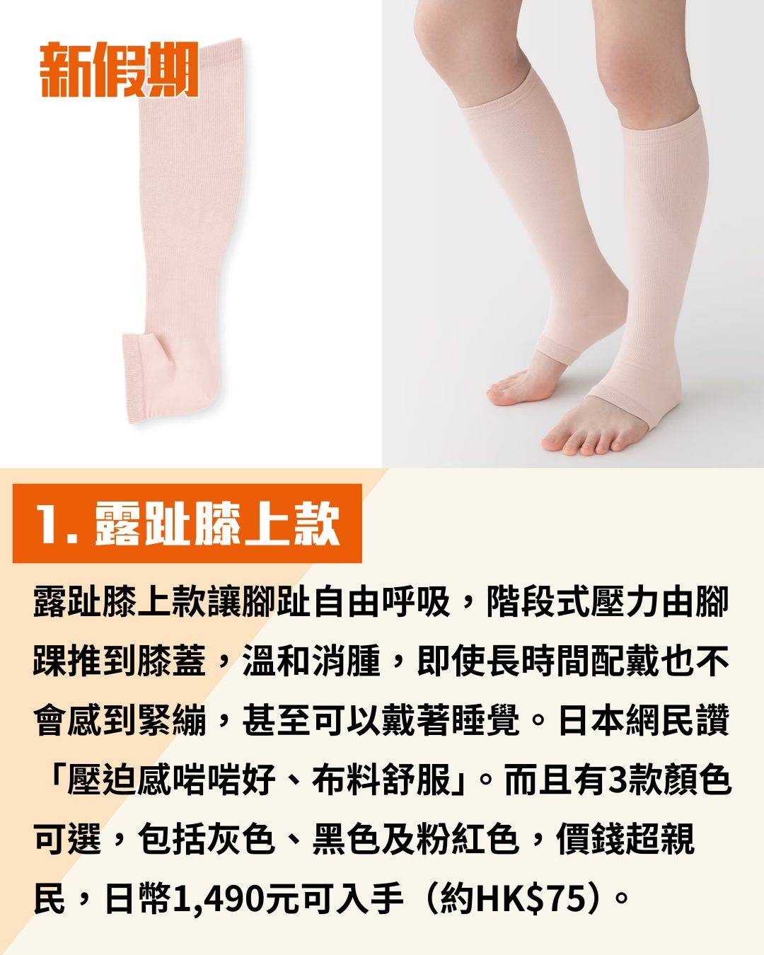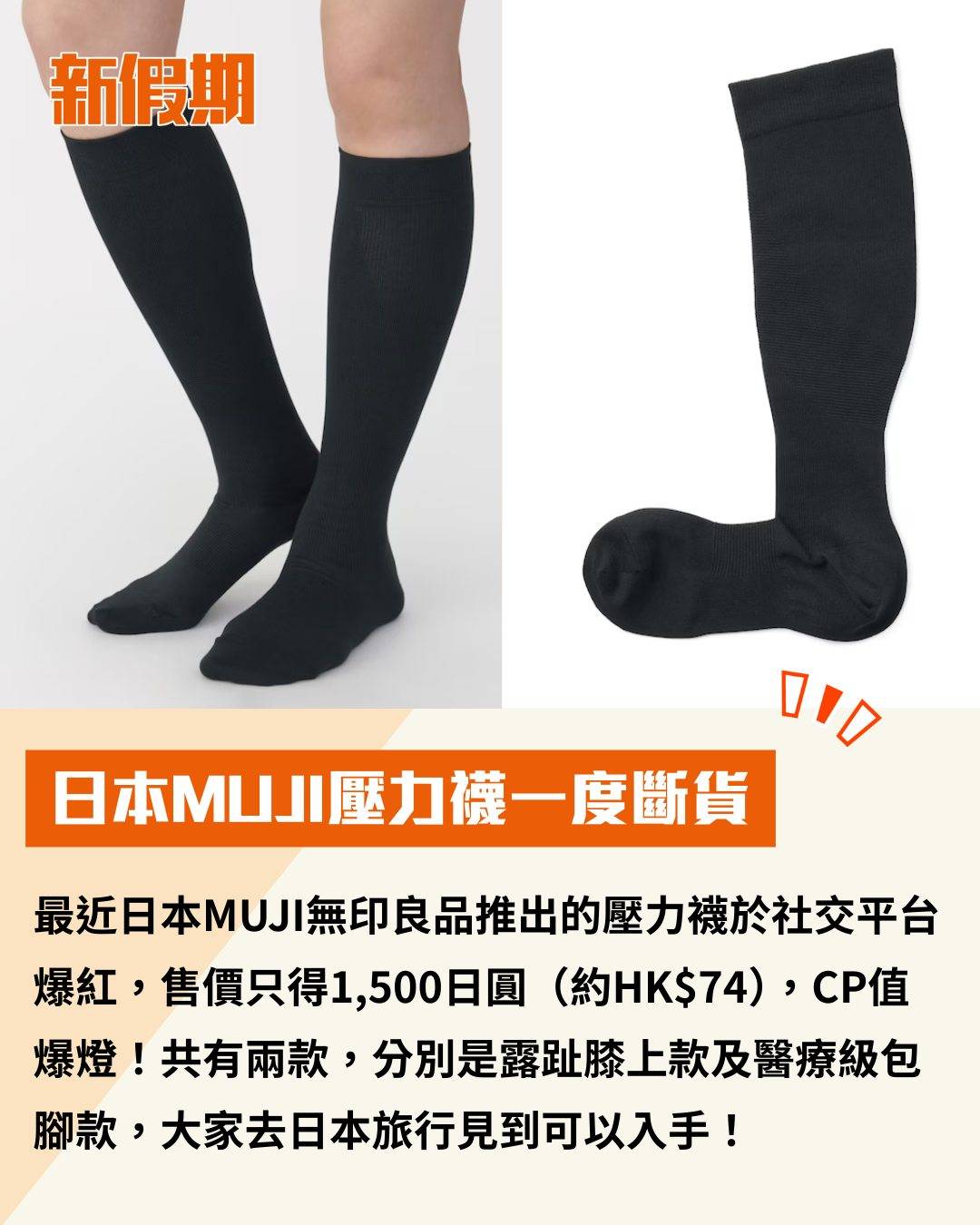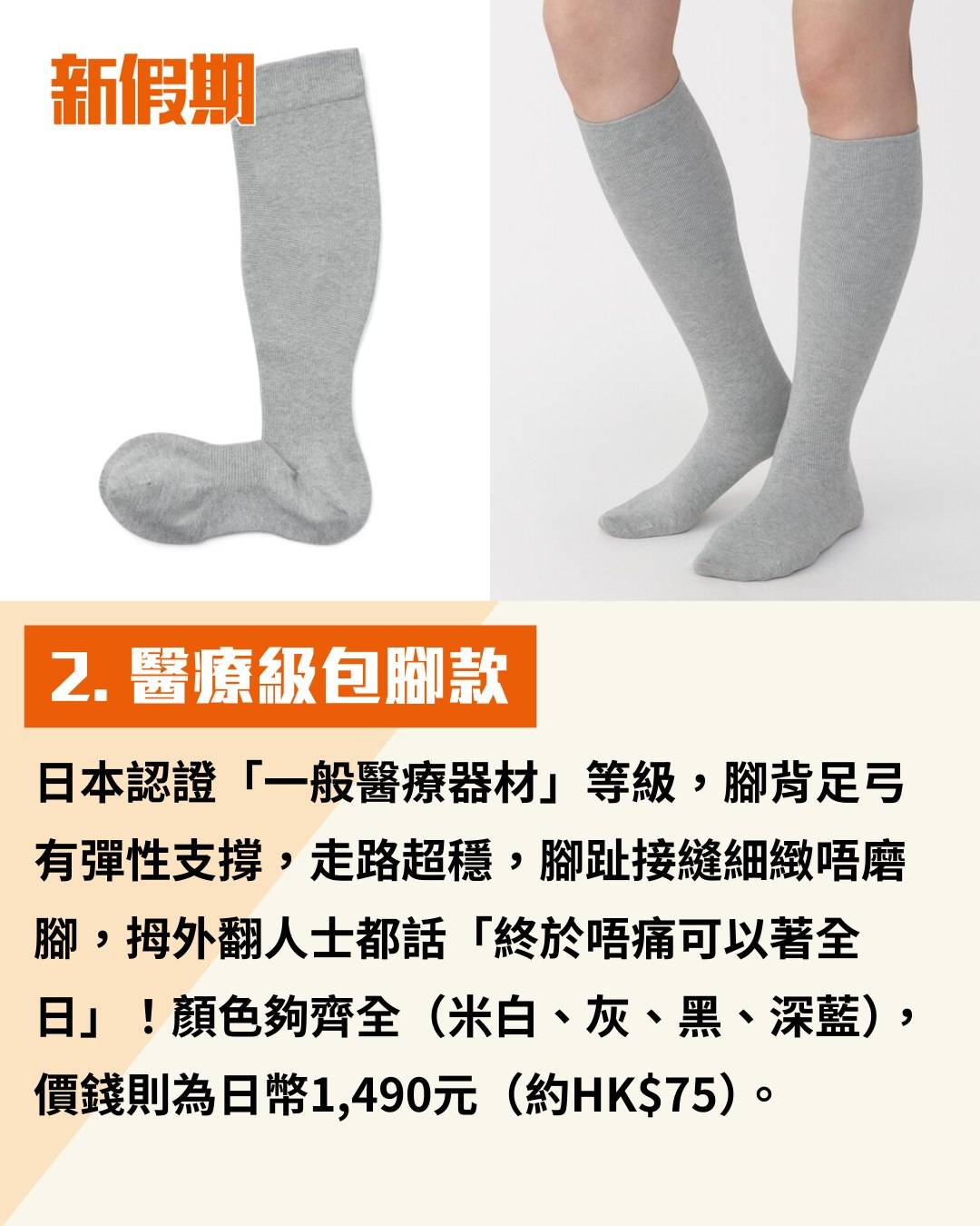 最近日本MUJI無印良品推出的壓力襪於社交平台爆紅,售價只得1,500日圓(約HK$74),CP值爆燈!共有兩款,分別是露趾膝上款及醫療級包腳款,大家去日本旅行見到可以入手!
