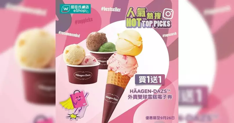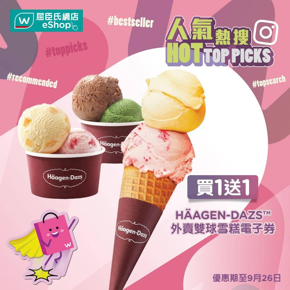 由即日起至9月26日到屈臣氏網店購買🔥 Häagen-Dazs™外賣雙球雪糕電子券⏰買一送一優惠,立即選購享受雙倍美味,雙倍快樂🌟:立即購買