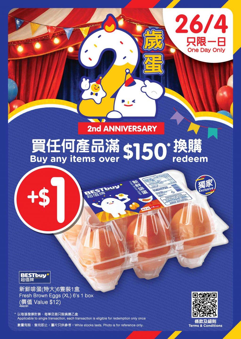 為了與眾同樂,「佳蛋仔」和「百便星」生日當天(4月26日)將推出一日限定的「$1換購特大啡蛋」活動。凡於香港百佳及旗下指定門市或PNS網購購物滿$150,即可加$1換購一盒6隻裝的超值牌新鮮啡蛋(價值$12),限量25,000盒,換完即止。
