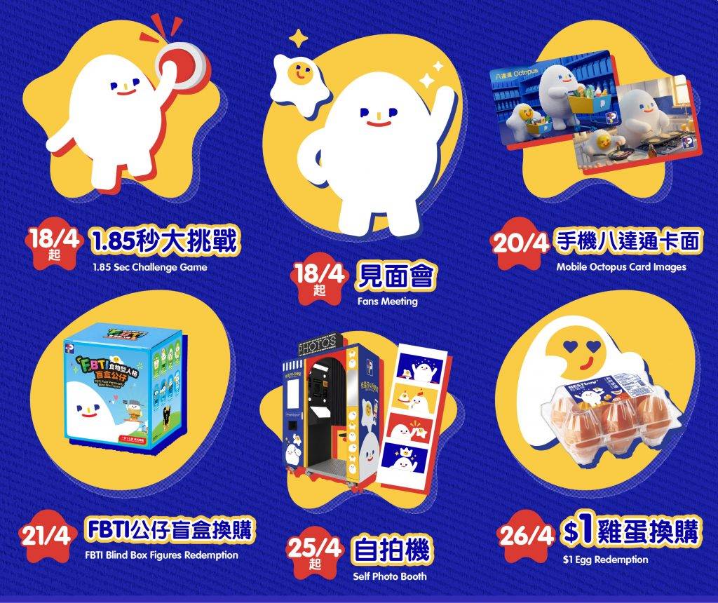 6 大慶生活動包括:1 日限定「$1 換購特大啡蛋」、粉絲必到的「生日派對見面會」、考考大家眼明手快的「1.85 秒大挑戰」、超市首創的「佳蛋仔自拍機」及期待已久的第二浪「佳蛋仔手機八達通卡面」外,更特別推出 1 套 17 款「F」BTI 食物型人格盲盒公仔,各位「佳蛋」粉絲萬密錯過!