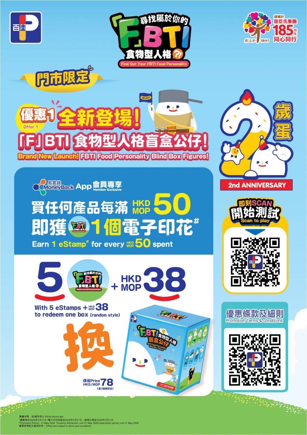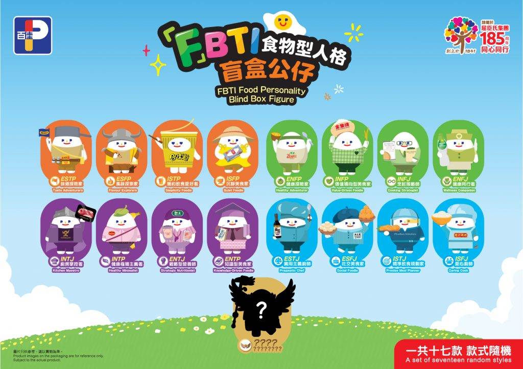 各位盲盒迷有福了!百佳這次特別推出一套17款的「F」BTI 食物型人格盲盒公仔,當中「佳蛋仔」化身成16種不同的食物型人格,另外還有1款神秘隱藏版,造型趣緻可愛,極具收藏價值。由2026年4月21日至5月21日,易賞錢App會員於全線香港或澳門百佳門市或PNS網購每購物滿$50,即可獲贈電子印花1個。集齊5個電子印花,便能以$38優惠價換購「F」BTI盲盒公仔1個,換購期至5月31日,想儲齊一套就要把握機會!