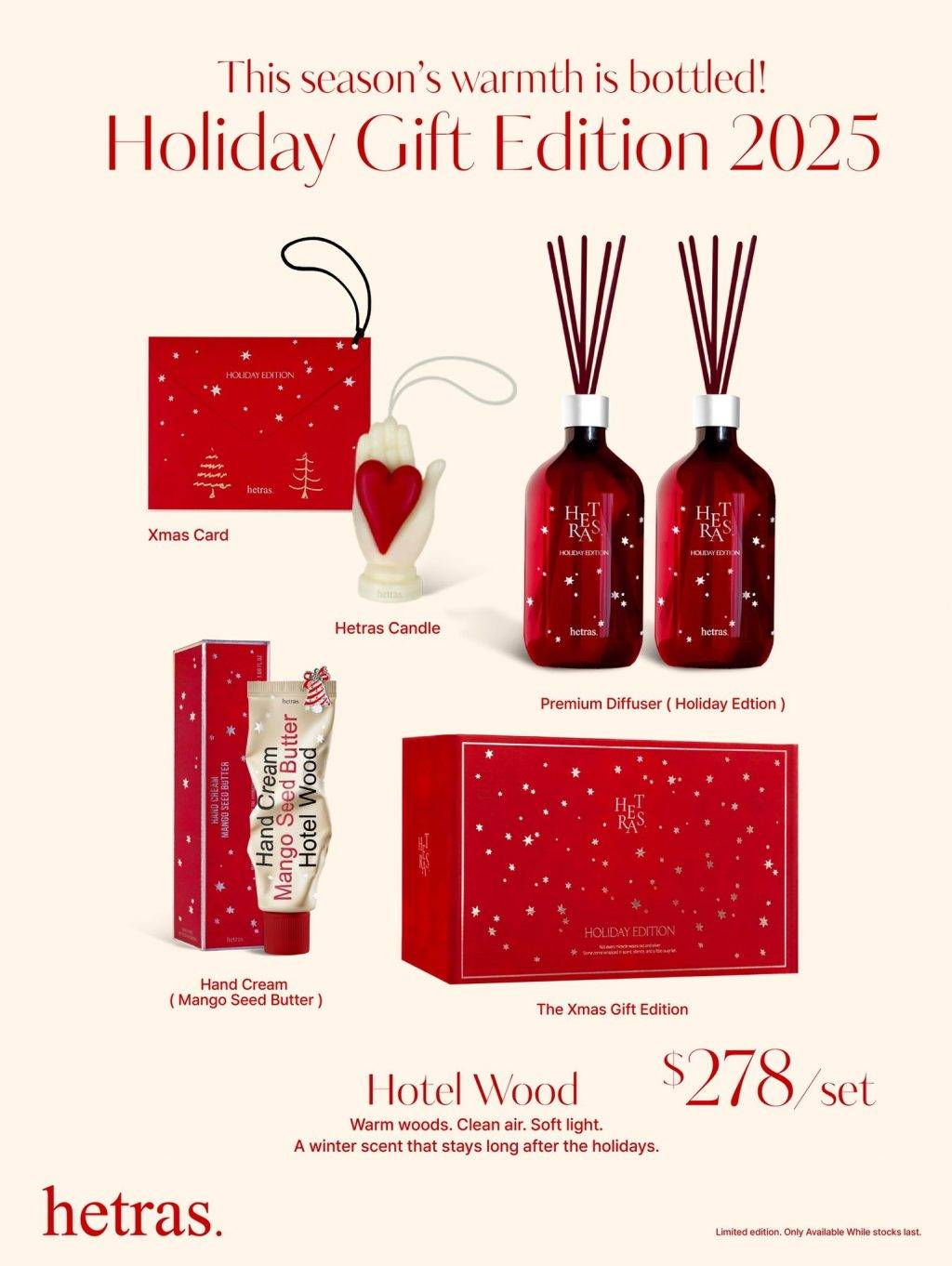 這個聖誕,hetras 將推出限量聖誕禮盒,集合品牌多款人氣香氛及熱賣單品,包括高級擴香、護手霜、心形香氛蠟燭及香氛香包等,配以精美包裝,是節日送禮或自用皆宜的貼心之選。