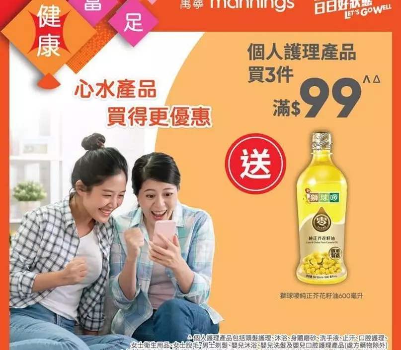 ✅個人護理產品△買3件滿$99†送獅球嘜純正芥花籽油600毫升