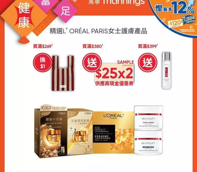 ✅精選L’ORÉAL PARiS女士護膚產品;買滿$269†加$1換L’ORÉAL PARiS針織手挽袋1件; 買滿$380†送供應商$25優惠券2張;買滿$399†送L‘ORÉAL活力緊緻鑽石奇蹟水1件