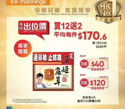 萬寧官方網店購物優惠由上午6時至晚上11時59分,數量有限,送/售完即止。部份產品/優惠不適用於澳門分店/萬寧官方網店,優惠受條款及細則約束,詳情請參閱www.mannings.com.hk 。
