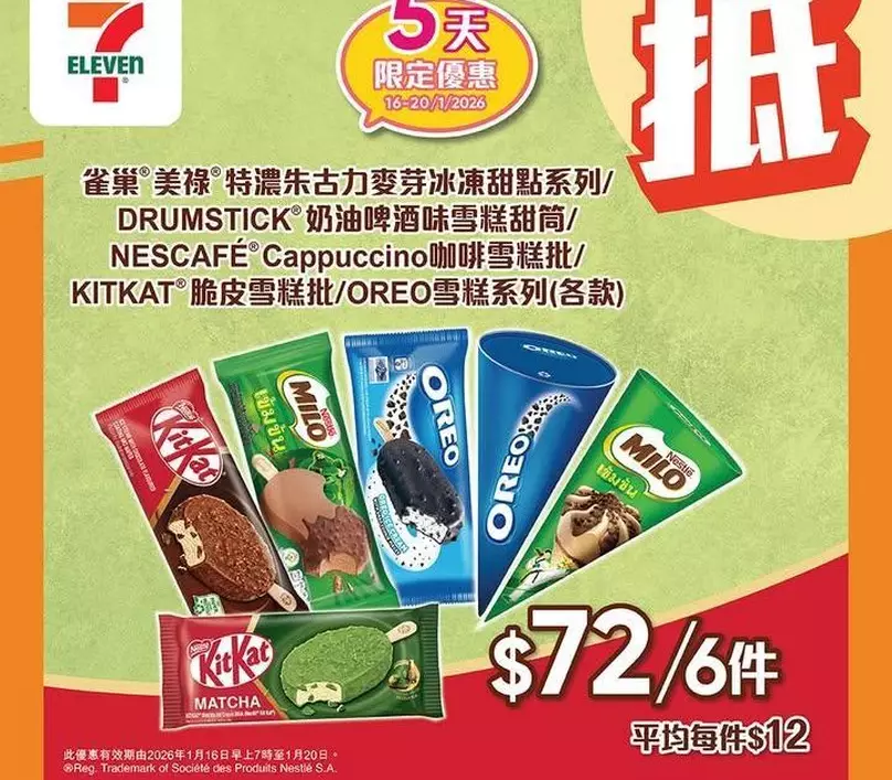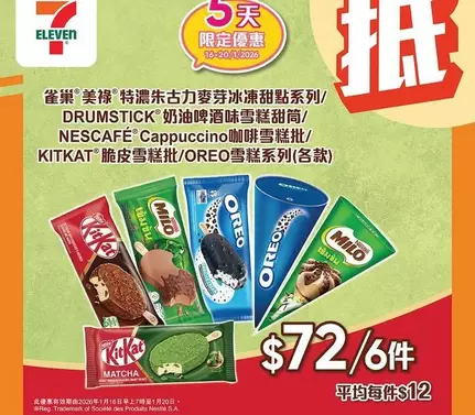 - 優惠詳情:$72 for 6 items including Nestlé Milo Intense Chocolate Malt Frozen Dessert, DRUMSTICK Cream Beer Flavor Ice Cream Cone, NESCAFÉ Cappuccino Ice Cream Pie, KITKAT Crispy Ice Cream Pie, OREO Ice Cream Series