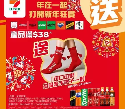 農曆新年就到啦!係時候同身邊最錫嘅人「年在一起拍住上」,一齊行大運啦❤️✨由即日起至至 2 月 10 日,喺 7 仔買指定「可口可樂」旗下有汽及無糖茶產品^滿$38*,即送限量版 可口可樂™ 磁吸牽手襪子一對🧦❤️!呢對襪嘅小手掌仲可以磁吸「拖住手」🫱🏻🫲🏻,去拜年、行街、影相都咁有型😎數量有限,換完即止,新年想配搭開運造型就快啲嚟7仔買汽水啦!🛒🎊