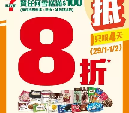 ✨由即日起至2月1日嚟7仔買任何雪糕滿$100 (不包括思樂冰、新地、冰包及冰杯),即享有 8折優惠*,俾你把握機會買齊心水雪糕返屋企😆! 😋咁著數,立即睇睇有咩精選產品,準備好嚟7仔入貨啦!