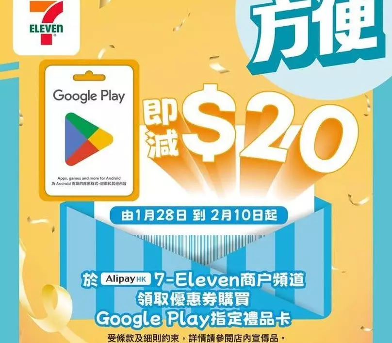 即刻去 AlipayHK 品牌專區拎優惠券,喺7-Eleven買 $200 / $500 / $1,000 Google Play 固定金額禮品卡,結帳時出示優惠券二維碼 + 用 AlipayHK 付款,即享 $20 折扣!💥