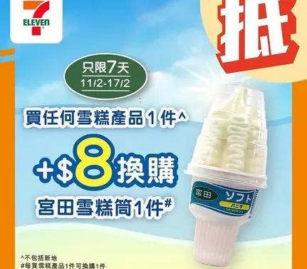 🪄由即日起至 2月17日,嚟 7 仔買任何雪糕產品1件^,即可+$8換購宮田雪糕筒1件^^!😍宮田雪糕柔滑香濃,想同家人、朋友歎盡雙重滋味🍨,就要把握限時優惠,快啲嚟 7 仔入手啦🛒💨