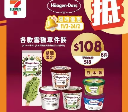 只需$108/6件*,平均只係 $18/件💕Häagen-Dazs雪糕濃香幼滑,食落每一啖都咁滿足😋!新春同親朋好友一齊開心 share,更加添好意頭🎊 🍨限時優惠咁抵,當然要即刻嚟7仔入貨啦!🛒