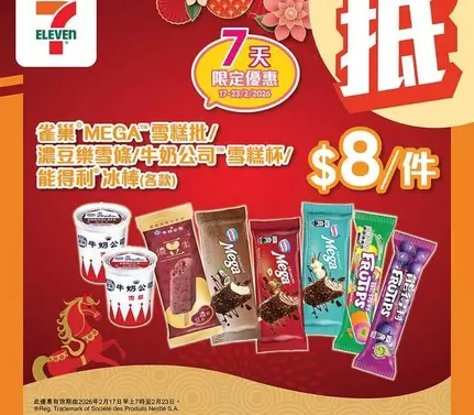 新一年梗係要食返啲甜品增添好意頭啦❤️7 仔送你開運優惠✨ 由即日起至2月23日嚟7仔購買雀巢MEGA雪糕批/濃豆樂雪條/牛奶公司雪糕杯/能得利冰棒(各款),只係需要$8/件^🤩
