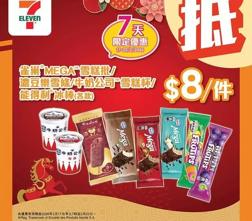 ^優惠有效期由2026年2月17日早上7時至2月23日。優惠只適用於香港店舖。部分貨品只限於指定店舖提供。貨品數量有限,售完即止。價格於香港店舖以港幣為單位。如有爭議,所有價格以個別店舖為準。貨品圖片只供參考。就一切有關事宜,7-Eleven 將保留最終之決定權。