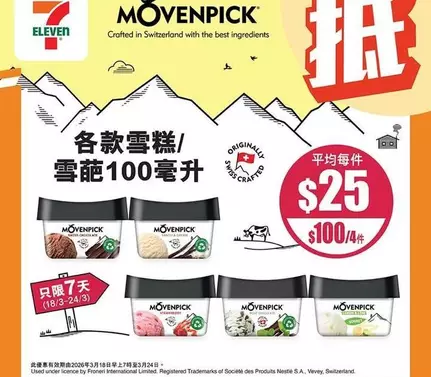 🪄由即日起至 3月24日嚟 7 仔買各款 MOVENPICK 雪糕/雪葩100毫升 只需$100/4件*🍨💕,平均每件$25 ! MOVENPICK 雪糕質地幼滑,雪葩果味清爽✨ 每款都咁吸引, 無論煲劇歎住食定係想同人 share,都係一流享受😋~即刻嚟 7 仔入貨啦💨