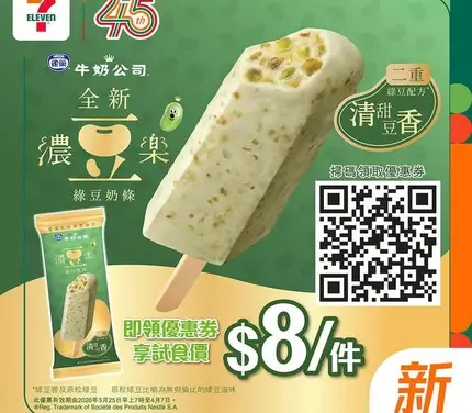 🪄由即日起至 4 月 7 日,只要掃描圖中 QR Code 下載電子優惠券,就可以嚟7仔用試食價 $8/件入手濃豆樂綠豆雪條*!雀巢濃豆樂綠豆雪條以「二重綠豆」配方打造💚 ,雪條內一次過有齊原粒綠豆同埋慢煮綠豆蓉,兩種口感層層交疊,香濃之餘又唔膩✨,好啱鍾意豆香嘅你 ❣️各位綠豆控即刻嚟 7 仔入貨啦🛒!