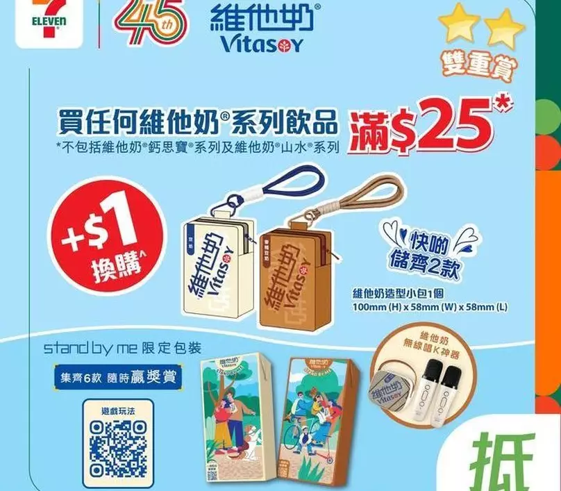 🪄由 4 月 22 日至 5 月 5 日,嚟 7 仔買 任何維他奶豆奶產品^滿 $25,即可 +$1 換購「維他奶造型小包」1 件*!飲豆奶之餘,仲可以換購實用又可愛嘅限時小禮品~