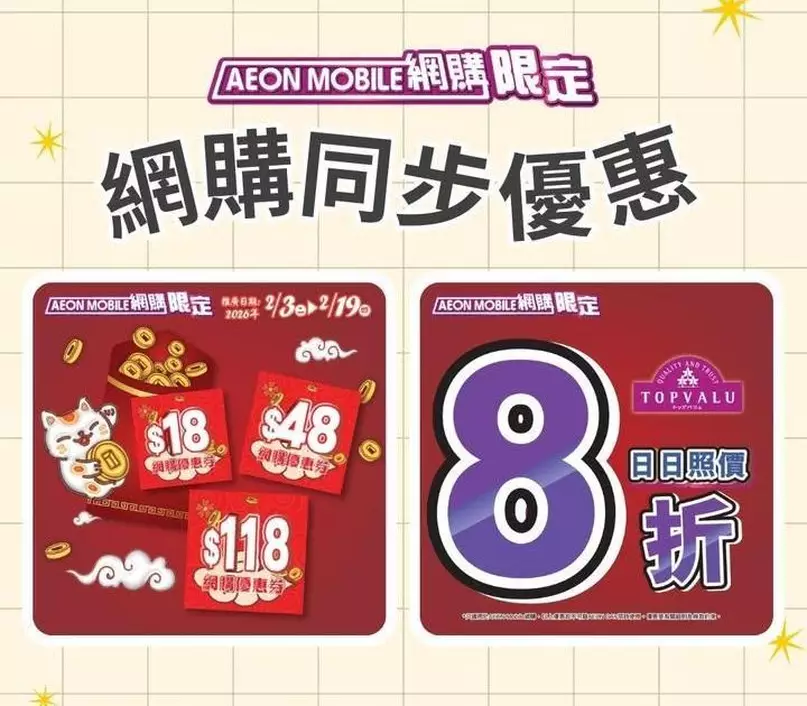 *只適用於AEON Mobile網購。以上優惠恕不可與AEON DAY同時使用。