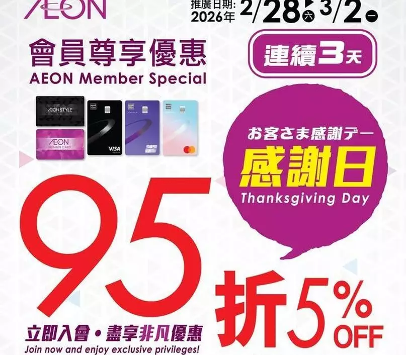 • 優惠詳情:AEON會員可享感謝日95折