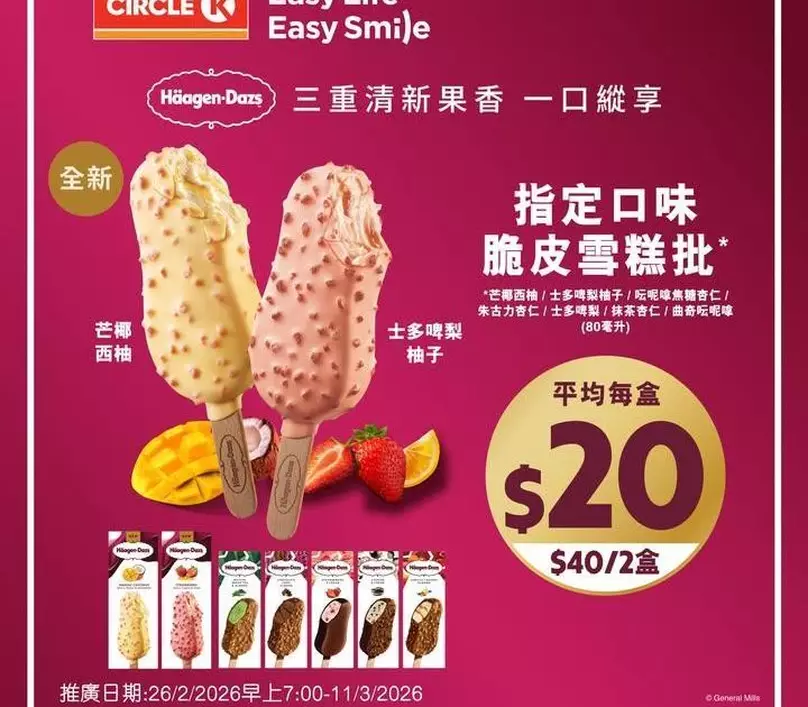 - 優惠詳情:購買指定口味Häagen-Dazs™雪糕批(80毫升),即可享$40/2盒優惠,平均每盒只係$20