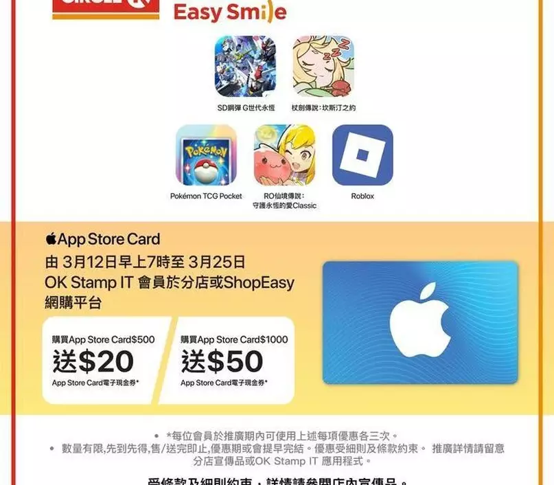 親愛嘅 OK Stamp It 會員🧡,超抵優惠嚟喇!由 3月12日早上7時至3月25日 期間,去 Circle K 分店或 ShopEasy 網購平台購買指定金額 App Store Card,除咗有現金券回贈,埋單輸入優惠碼【MAR10】仲可以即時減 $10!