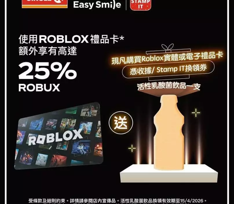 只要喺分店購買實體禮品卡,或者透過 OK Stamp IT ShopEasy 購買電子禮品卡,除咗可以額外獲得高達 25% Robux 之外,仲額外送你 活性乳酸菌飲品一支!🥤✨
