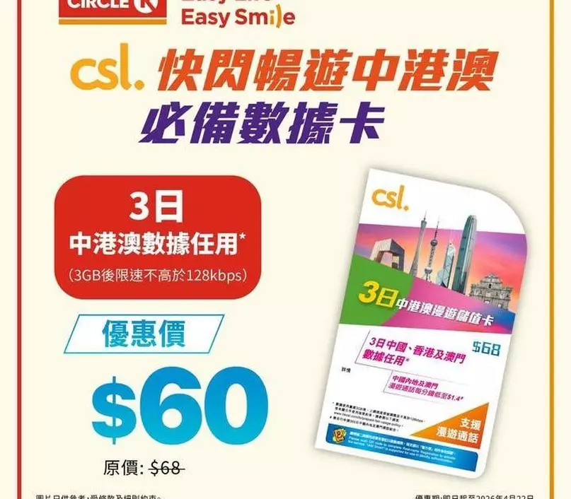 而家嚟 Circle K以$38優惠價買購 csl 4G數據月卡 (原價: $98) 📱,有齊本地數據及本地通話分鐘,足夠每日基本上網、溝通及暢遊社交媒體所需!🌐 另外,仲有北上必備,$60就買到 3日中港澳漫遊數據卡 🌏,3日3GB漫遊數據任用 (3GB後限速不高於128kbps) 📉。~即刻嚟入手啦!🛍️✨