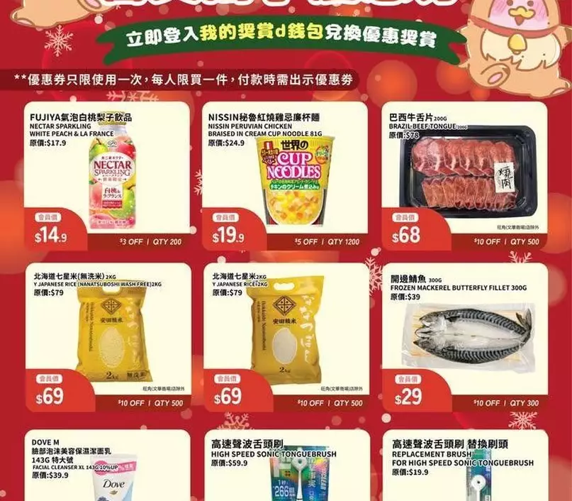 - 優惠詳情:Exclusive member prices on selected products including fish, frozen meat, rice, snacks and beverages, facial cleansers, and tongue brushes.