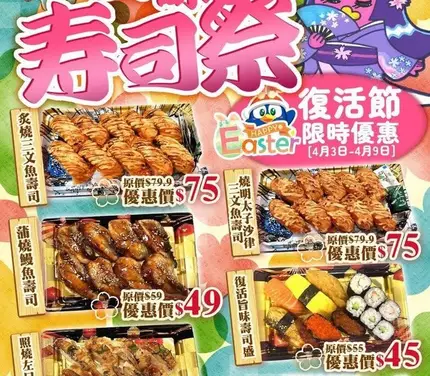 - 優惠詳情:黃金復活 · 炙燒三文魚壽司:優惠價 $75
