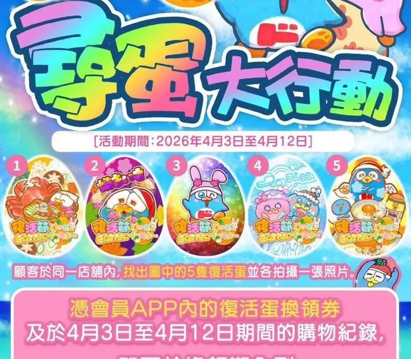 🥚消費及拍攝復活蛋照片活動期📅 :2026年4月3日至12日�🥚復活蛋換領券換領店舖📍:DON DON DONKI 九龍灣(淘大商場)店(九龍灣淘大商場第3期一樓F188-204號舖)�🥚復活蛋換領券換領期📅 :2026年4月13日起至換完即止�