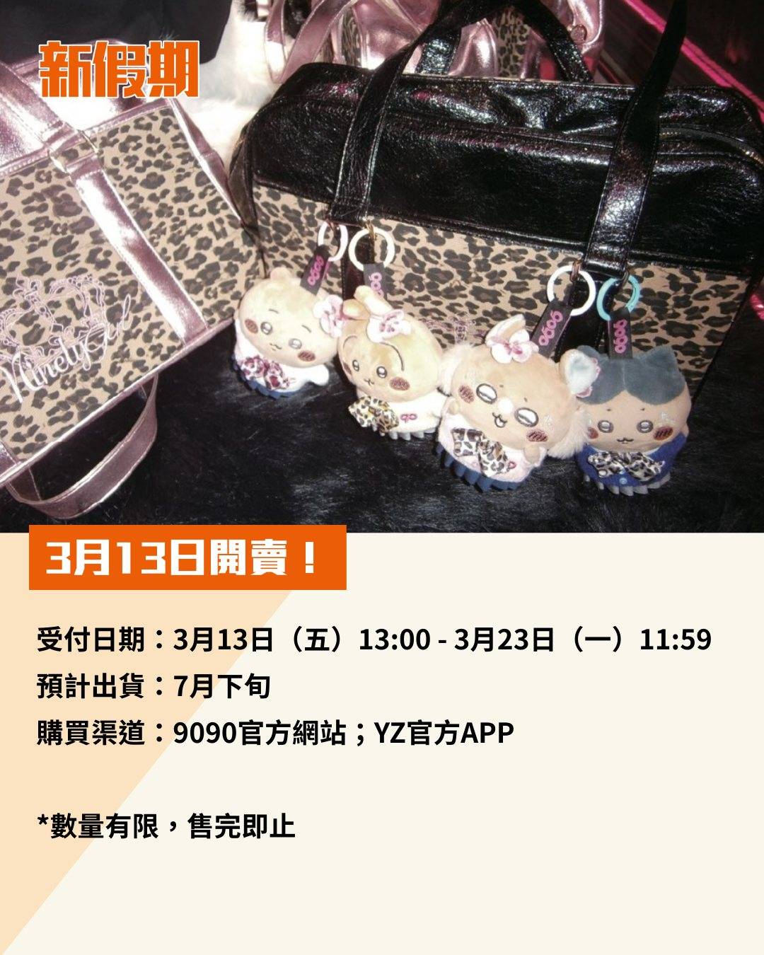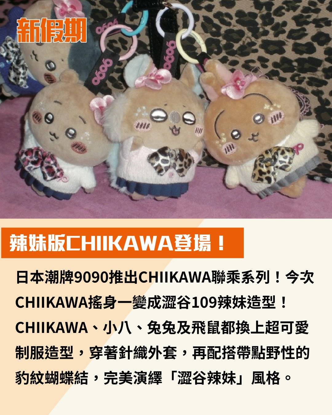 日本潮牌9090推出CHIIKAWA聯乘系列!今次CHIIKAWA搖身一變成澀谷109辣妹造型!CHIIKAWA、小八、兔兔及飛鼠都換上超可愛制服造型,穿著針織外套,再配搭帶點野性的豹紋蝴蝶結,完美演繹「澀谷辣妹」風格。