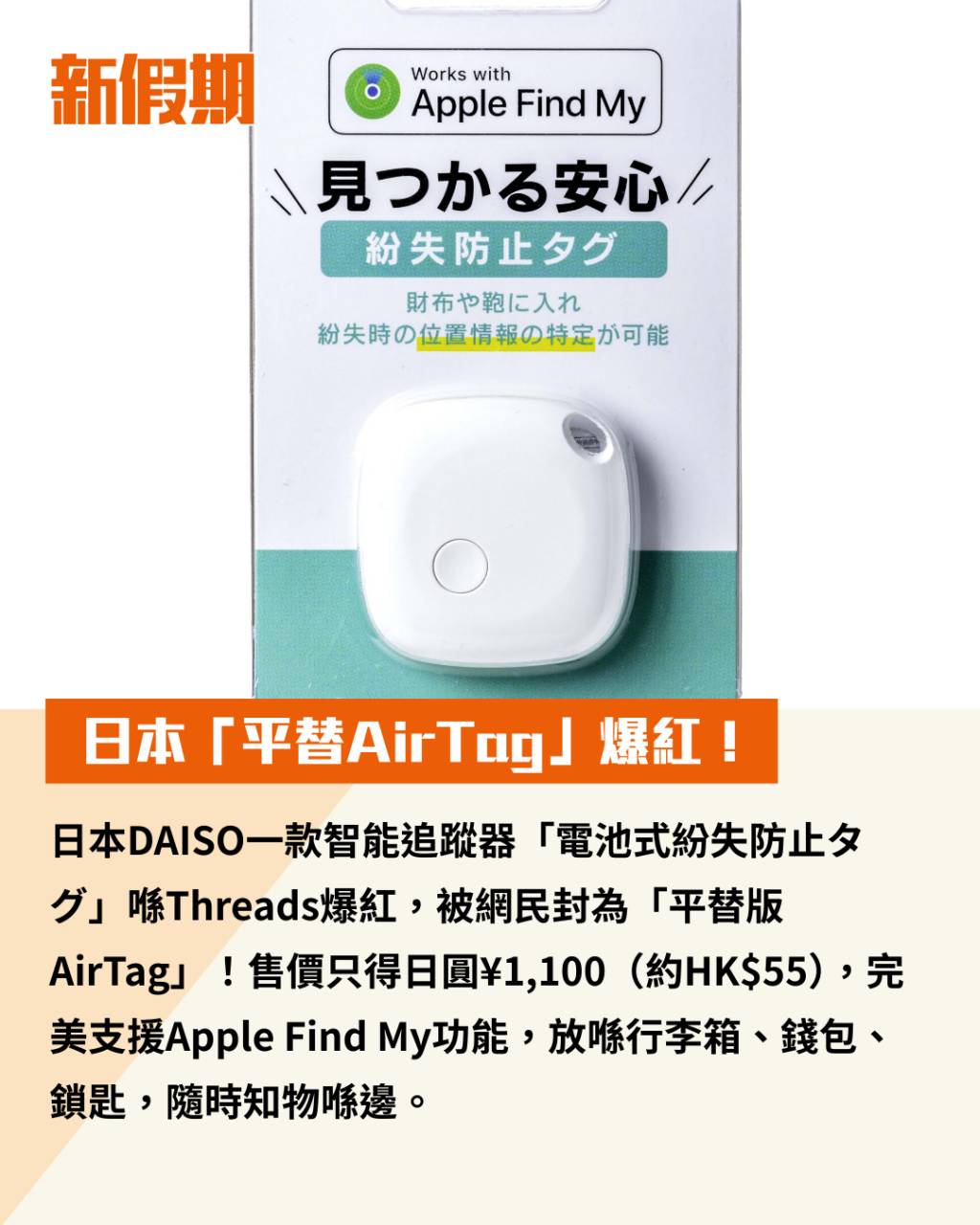 日本DAISO一款智能追蹤器「電池式紛失防止タグ」喺Threads爆紅,被網民封為「平替版AirTag」!售價只得日圓¥1,100(約HK$55),完美支援Apple Find My功能,放喺行李箱、錢包、鎖匙,隨時知物喺邊。