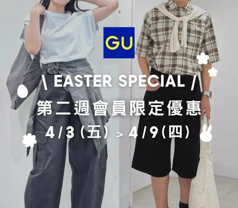 一連兩週EASTER SPECIAL會員限定優惠,嚟到第二週繼續有多款商品俾你揀~ ✨想趁機會入手定夏季新衫就要喺4/9(四)前嚟GU喇!🥳由於反應熱烈,指定男、女、童裝首週限定優惠商品更已延長優惠價格至4/7(二),其中包括超人氣嘅神褲升級版Barrel Ankle系列褲款!👀想睇晒所有限定優惠商品就記得開GU APP喇!