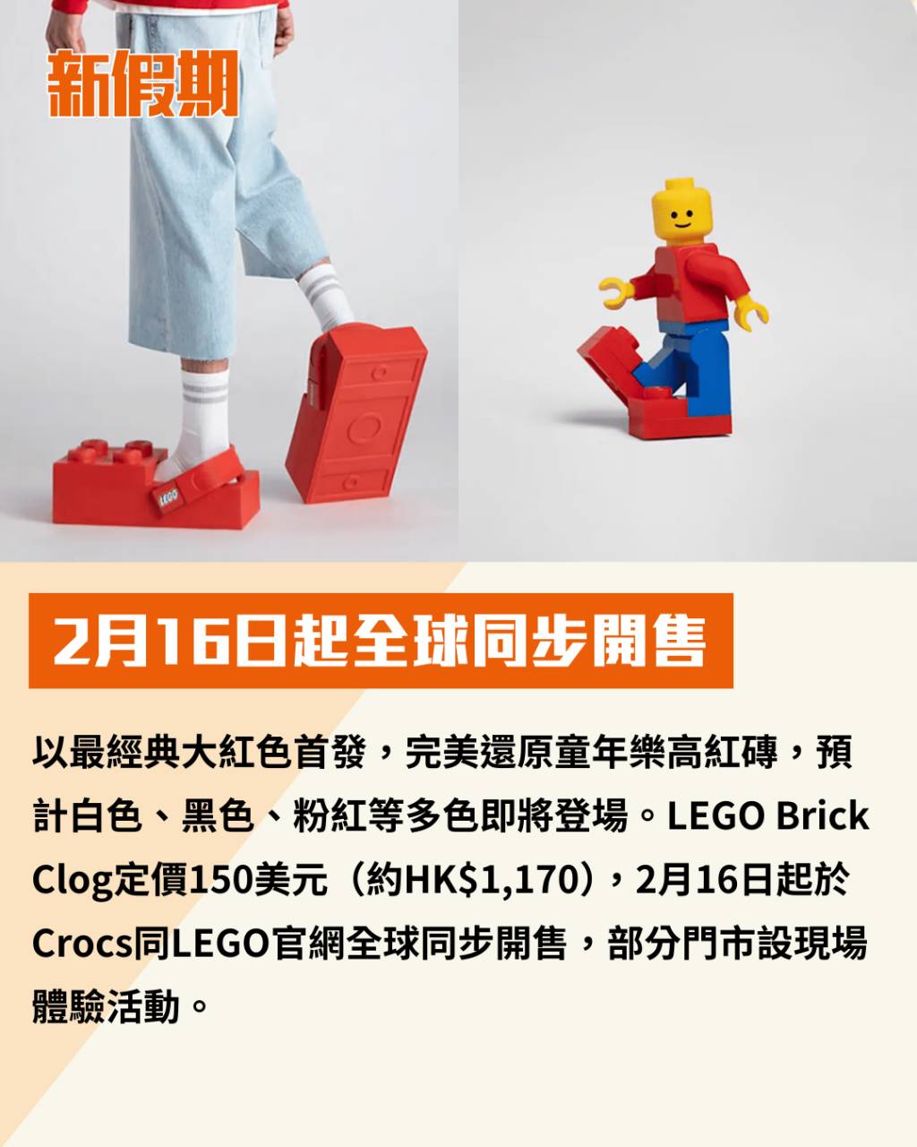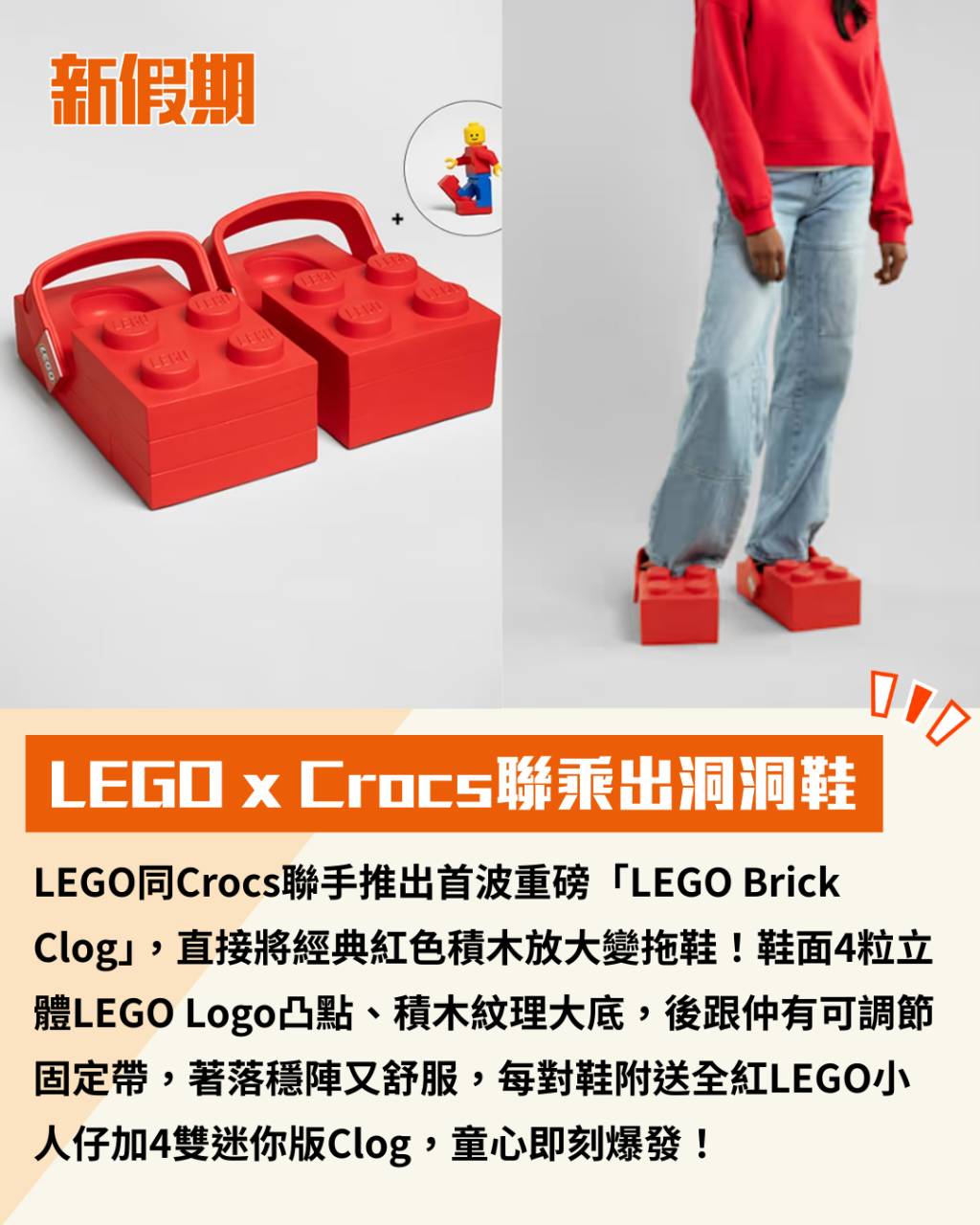 LEGO同Crocs聯手推出首波重磅「LEGO Brick Clog」,直接將經典紅色積木放大變拖鞋!鞋面4粒立體LEGO Logo凸點、積木紋理大底,後跟仲有可調節固定帶,著落穩陣又舒服,每對鞋附送全紅LEGO小人仔加4雙迷你版Clog,童心即刻爆發!