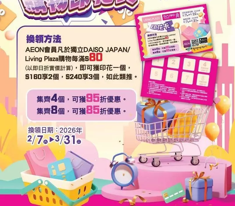由即日起至3月22日期間,AEON會員於獨立DAISO JAPAN或Living PLaza店內購物每滿$80 (折實單一發票計),即可獲贈印花一個。集齊4個印花,可獲95折優惠;集齊8個印花,即可享85折優惠一次。⭐⭐⭐⭐唔好錯過啦!~