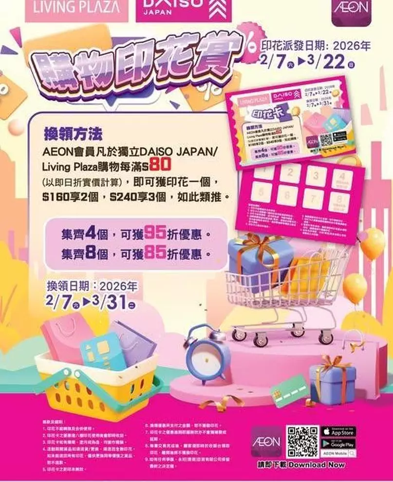 由即日起至3月22日期間,AEON會員於獨立DAISO JAPAN或Living PLaza店內購物每滿$80 (折實單一發票計),即可獲贈印花一個。集齊4個印花,可獲95折優惠;集齊8個印花,即可享85折優惠一次。⭐⭐⭐⭐唔好錯過啦!~