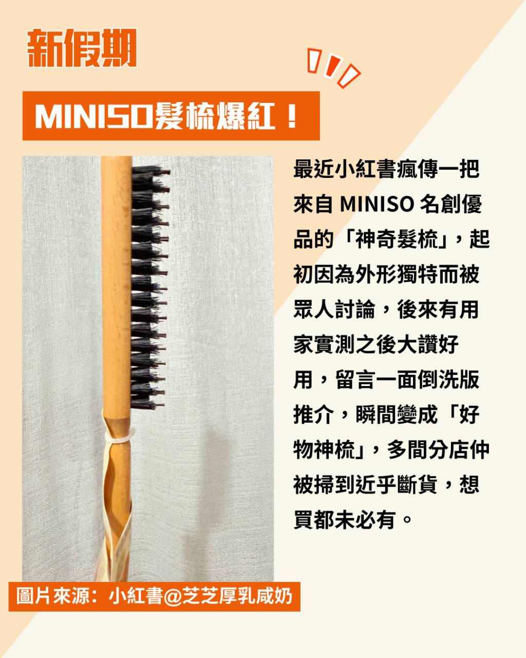 最近小紅書瘋傳一把來自 MINISO 名創優品的「神奇髮梳」,起初因為外形獨特而被眾人討論,後來有用家實測之後大讚好用,留言一面倒洗版推介,瞬間變成「好物神梳」,多間分店仲被掃到近乎斷貨,想買都未必有。